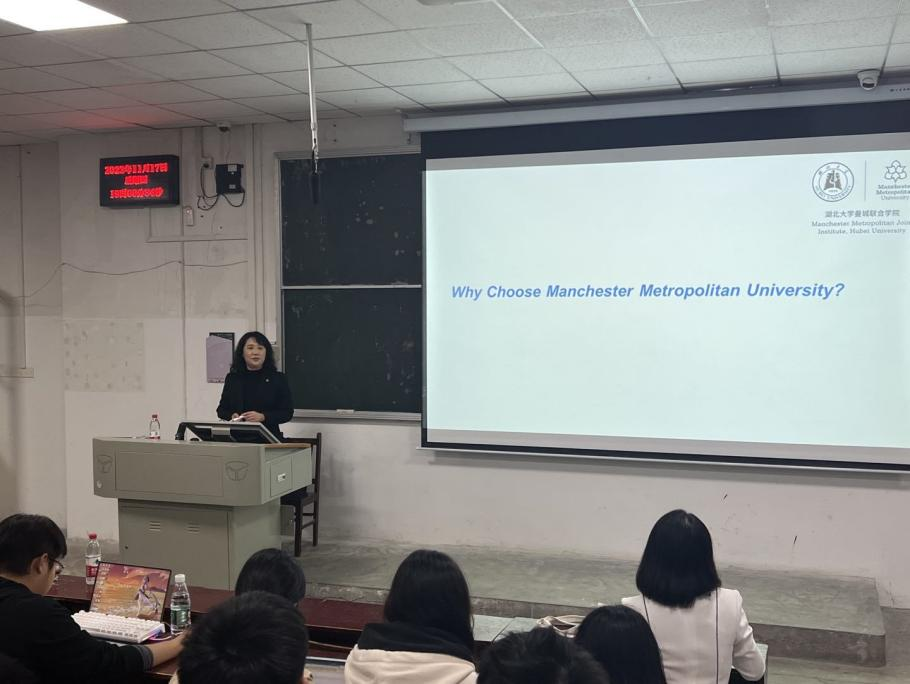 讲座主题是Why choose to study a joint dual award Bachelor's degree at the Manchester Metropolitan Joint Institute, Hubei University? Hong Li结合自身经历和曼彻斯特城市大学的材料科学与工程、电子信息与工程和软件工程专业的特点及多年来取得的优异成绩,展示了曼城大良好的学习环境,给出了尽快适应中英文教学环境的建议。她谈到,中英联合培养有利于提高同学们的全球胜任力,这一办学模式能够为同学们创造更广阔的发展空间,她期望同学们综合能力借此得到提升,并介绍了英方为员工设立的专项双向国际交流奖学金情况,鼓励同学们前往曼城大继续学习。