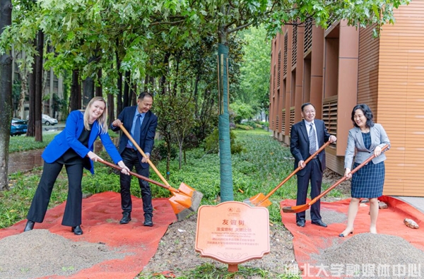 Olivia Hildebrand、王世敏、蒋涛、Hong Li等共同种下“友谊树”,致谢设立国际人才奖学金的李启鸿博士,并共祝威廉希尔与曼彻斯特城市大学的友谊长存。员工代表张艺冰、方睿阳分别以中英文致谢,表示将珍惜威廉希尔与曼彻斯特城市大学创设的良好平台,铭记李启鸿博士的关怀与支持,不断提升专业素养,努力成为栋梁之材。