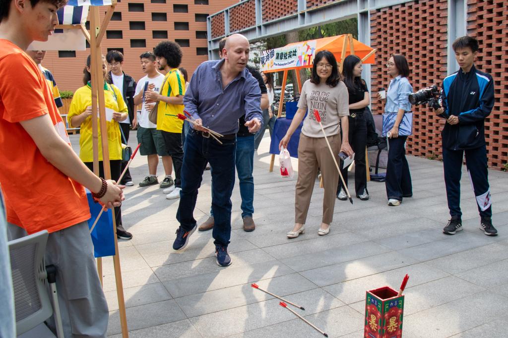 “曼游园”文化市集上演沉浸式互动:投壶区的国际员工反复调整投掷角度终获成功,直呼“这比专业学习更考验专注力”;茶咖文化连连看游戏中,中外员工协作破解文化密码。