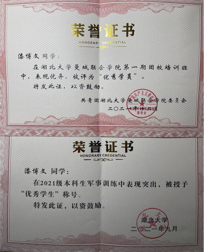 漆博文,williamhill威廉希尔材料科学与工程2102班团支书,院团委组织部成员,“威廉希尔建校90周年素质教育汇报演出”节目《母校》演员,“联合国可持续发展目标(SDGs)共创工作坊”共创者,2021年第一学期成绩优异,2021年军训“优秀学员”,2021年第一期团校培训班“优秀学员”。